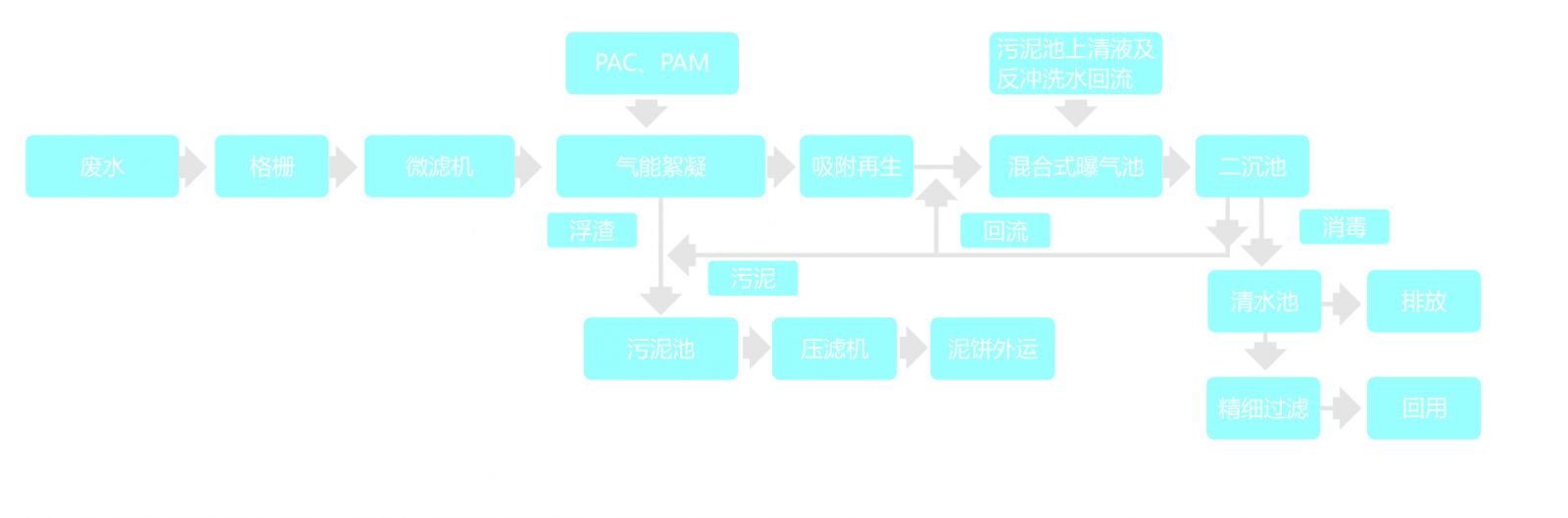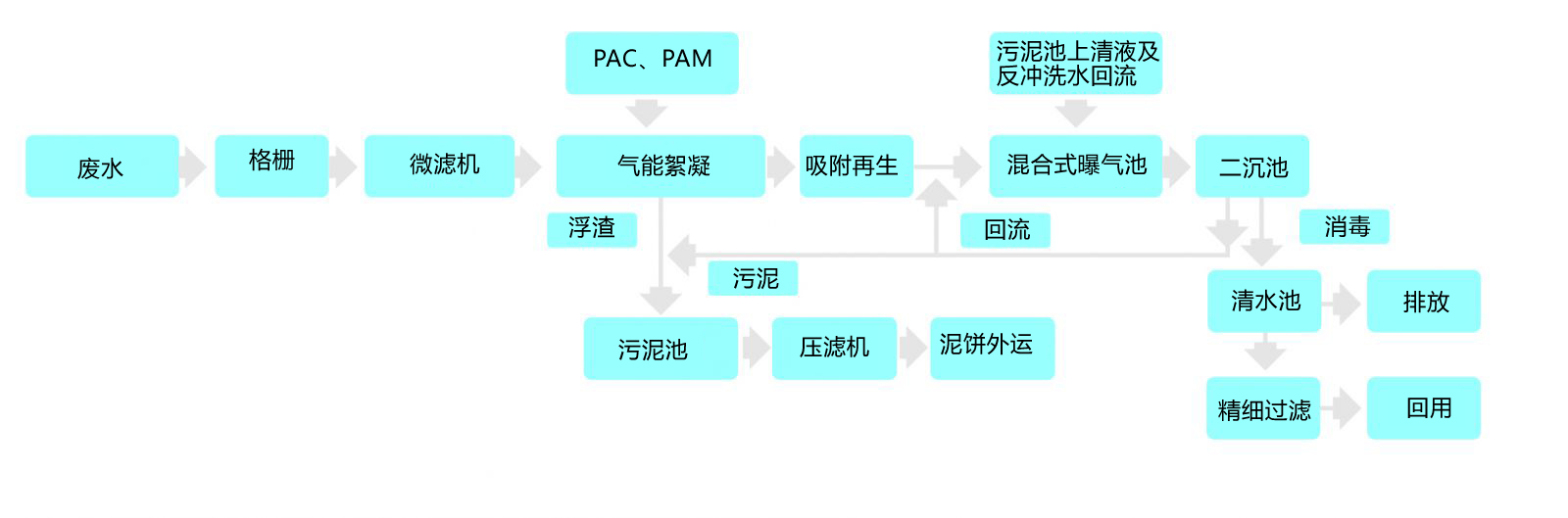 廢水通過(guò)格柵去除浮渣,經(jīng)由微濾機(jī)回收紙漿后進(jìn)入氣能絮凝系統(tǒng),通過(guò)投加混凝劑,再經(jīng)其凝聚、氣浮、撇渣、沉淀、刮泥處理后可去除污水中85% 以上的SS, 50%以上的非溶解性COD及部分溶解性COD和BOD。其出水進(jìn)入完全混合式曝氣池,通過(guò)向池內(nèi)補(bǔ)充投加N、P等營(yíng)養(yǎng)物質(zhì),并利用吸附再生池增強(qiáng)回流污泥的微生物活性等方式高效降解污水中的有機(jī)物質(zhì)。出水經(jīng)由二沉池進(jìn)行固液分離,上清液消毒達(dá)標(biāo)后外排或精細(xì)過(guò)濾后回用。