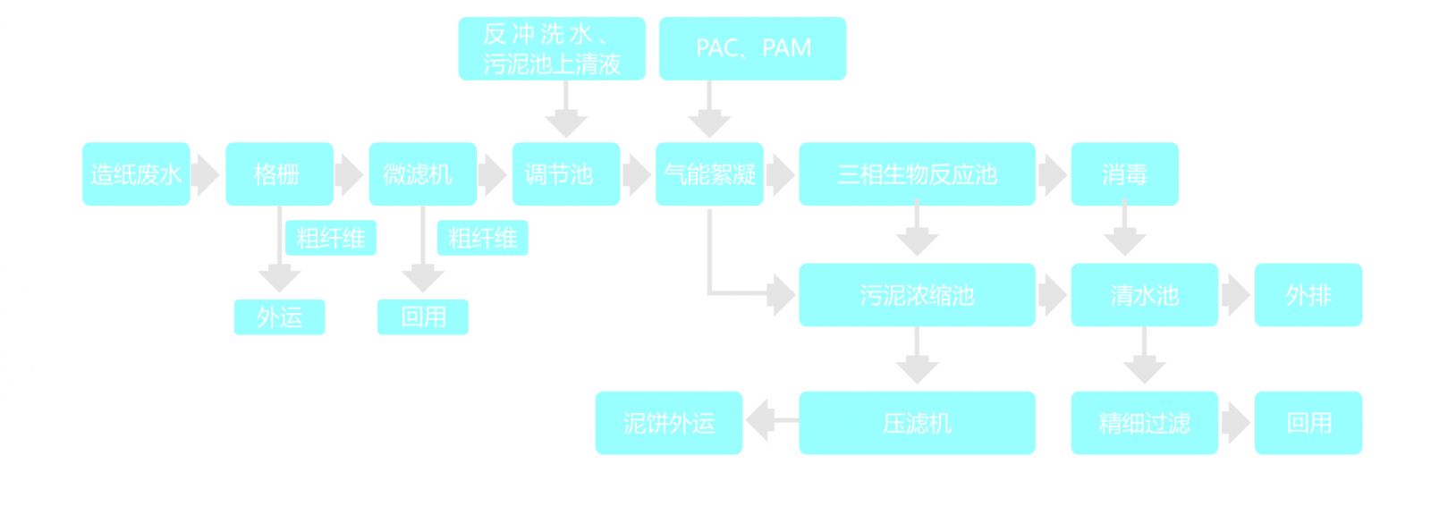 廢水通過格柵去除浮渣,經(jīng)由微濾機(jī)回收紙漿后進(jìn)入氣能絮凝系統(tǒng),通過投加混凝劑,再經(jīng)其凝聚、氣浮、撇渣、沉淀、刮泥處理后可去除污水中85% 以上的SS, 50%以上的非溶解性COD及部分溶解性COD和BOD。其出水進(jìn)入完全混合式曝氣池,通過向池內(nèi)補(bǔ)充投加N、P等營養(yǎng)物質(zhì),并利用吸附再生池增強(qiáng)回流污泥的微生物活性等方式高效降解污水中的有機(jī)物質(zhì)。出水經(jīng)由二沉池進(jìn)行固液分離,上清液消毒達(dá)標(biāo)后外排或精細(xì)過濾后回用。