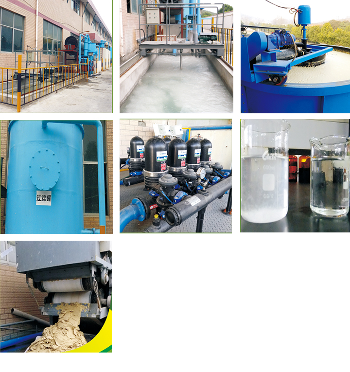廢水首先進(jìn)入調(diào)節(jié)池進(jìn)行水質(zhì)、水量調(diào)節(jié),提升后進(jìn)入兩級(jí)高濃除渣器去除廢水中的顆粒雜質(zhì),然后經(jīng)微濾機(jī)收集廢水中相對(duì)細(xì)小的棉渣回用,為后續(xù)處理工藝減輕負(fù)荷。出水經(jīng)泵提升至氣能絮凝系統(tǒng)加藥(PAM與PAC)混合后去除原水中所含的大量膠質(zhì),出水到沉降池,上清液經(jīng)消毒后可達(dá)標(biāo)外排。如中水回用,則提升至多級(jí)精細(xì)過濾系統(tǒng)過濾后進(jìn)入中間水池,經(jīng)超濾系統(tǒng)處理后回用。