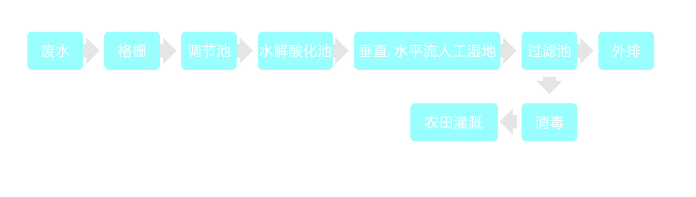 廢水經(jīng)格柵和調(diào)節(jié)池預(yù)處理后,進(jìn)入水解酸化池,污水中有機(jī)物通過附著在池內(nèi)填料中微生物膜的分解得到初步降解,固體懸浮物被沉降去除,有機(jī)物由大分子被分解成小分子而提高其可生化性。出水通過配水管網(wǎng)進(jìn)入垂直/水平流人工濕地系統(tǒng)的各個單元,利用土壤、人工介質(zhì)、植物、微生物的物理、化學(xué)、生物三重協(xié)同作用,其機(jī)理包括吸附、滯留、過濾、氧化還原、沉淀、微生物分解、轉(zhuǎn)化、各類植物對污水中營養(yǎng)源的吸收等,以實現(xiàn)去除污水中COD、BOD、氮磷等各種污染物的目標(biāo),人工濕地系統(tǒng)出水由過渡池外排或消毒后用于景觀澆灑、沖洗道路、灌溉農(nóng)田等。