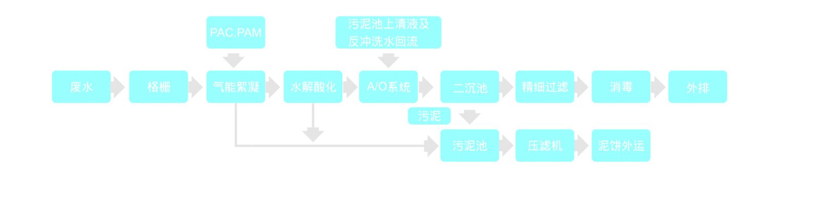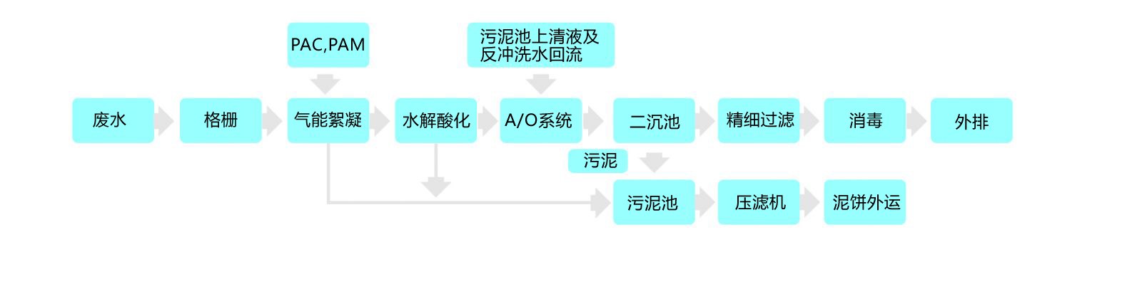 生產(chǎn)廢水經(jīng)過格柵排至氣能絮凝系統(tǒng),加入混凝藥劑,去除廢水中的色度和懸浮物后進(jìn)入水解酸化池,將廢水中溶解性大分子有機(jī)物轉(zhuǎn)化為結(jié)構(gòu)簡(jiǎn)單的小分子物質(zhì),提高廢水可生化性,出水接著進(jìn)入A/O系統(tǒng),通過缺氧/好氧工段高效去除COD并實(shí)現(xiàn)脫硝,經(jīng)二沉池進(jìn)行固液分離,上清液經(jīng)精細(xì)過濾、消毒后達(dá)標(biāo)外排。