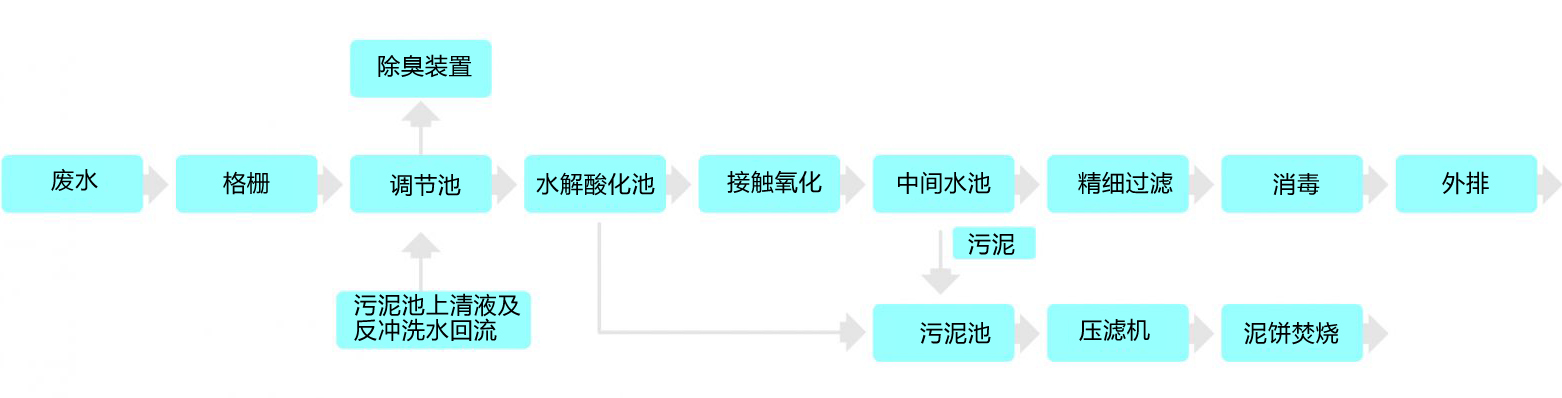 來自化糞池的污水經(jīng)機械格柵去除大的浮渣后,進入調(diào)節(jié)池均勻水質(zhì)、水量。調(diào)節(jié)池內(nèi)的廢氣經(jīng)生物除臭裝置處理后外排。出水進入水解酸化池,將大分子有機物轉(zhuǎn)化為小分子物質(zhì),降低COD負荷。接著進入接觸氧化池,污水中的有機污染物可被負載在填料上的生物膜高效降解,其出水經(jīng)由中間水池固液分離,上清液經(jīng)二級精細過濾、消毒后達標(biāo)外排。