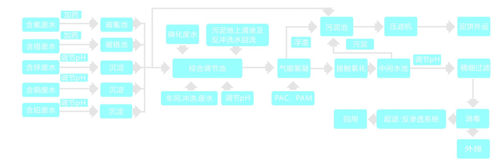 含氰、含鉻廢水投加特種還原劑后分別進(jìn)入破氰池與破鉻池,含鋅、含鉛、含銅、含鎘等廢水調(diào)pH后經(jīng)過沉降,上清液與磷化廢水混合后進(jìn)入綜合調(diào)節(jié)池,經(jīng)調(diào)節(jié)pH后進(jìn)入氣能絮凝系統(tǒng),高效去除廢水中懸浮物后進(jìn)入接觸氧化池,通過生物膜作用去除廢水中COD等有機(jī)污染物,出水經(jīng)由中間水池沉淀,上清液經(jīng)精細(xì)過濾排至消毒池,通過消毒處理后達(dá)標(biāo)外排;或經(jīng)超濾/反滲透系統(tǒng)處理后回用。
